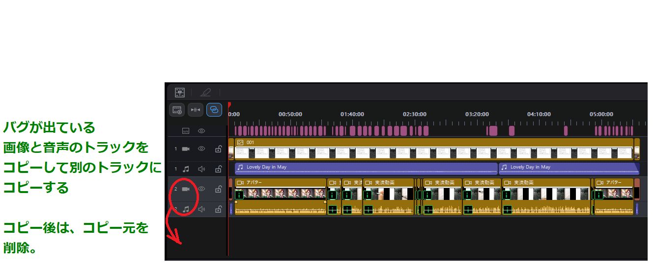 上図で言うと赤丸のトラック2がバグっているだろうトラックデータなんですが、これをトラック3に複製したんですよ。