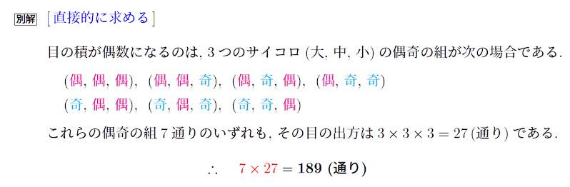 「全体数- 奇数の場合」 つまり $ 6^3 = 216, 3^3 = 27 $ 従って $ 216 -27 = 189 $ 。