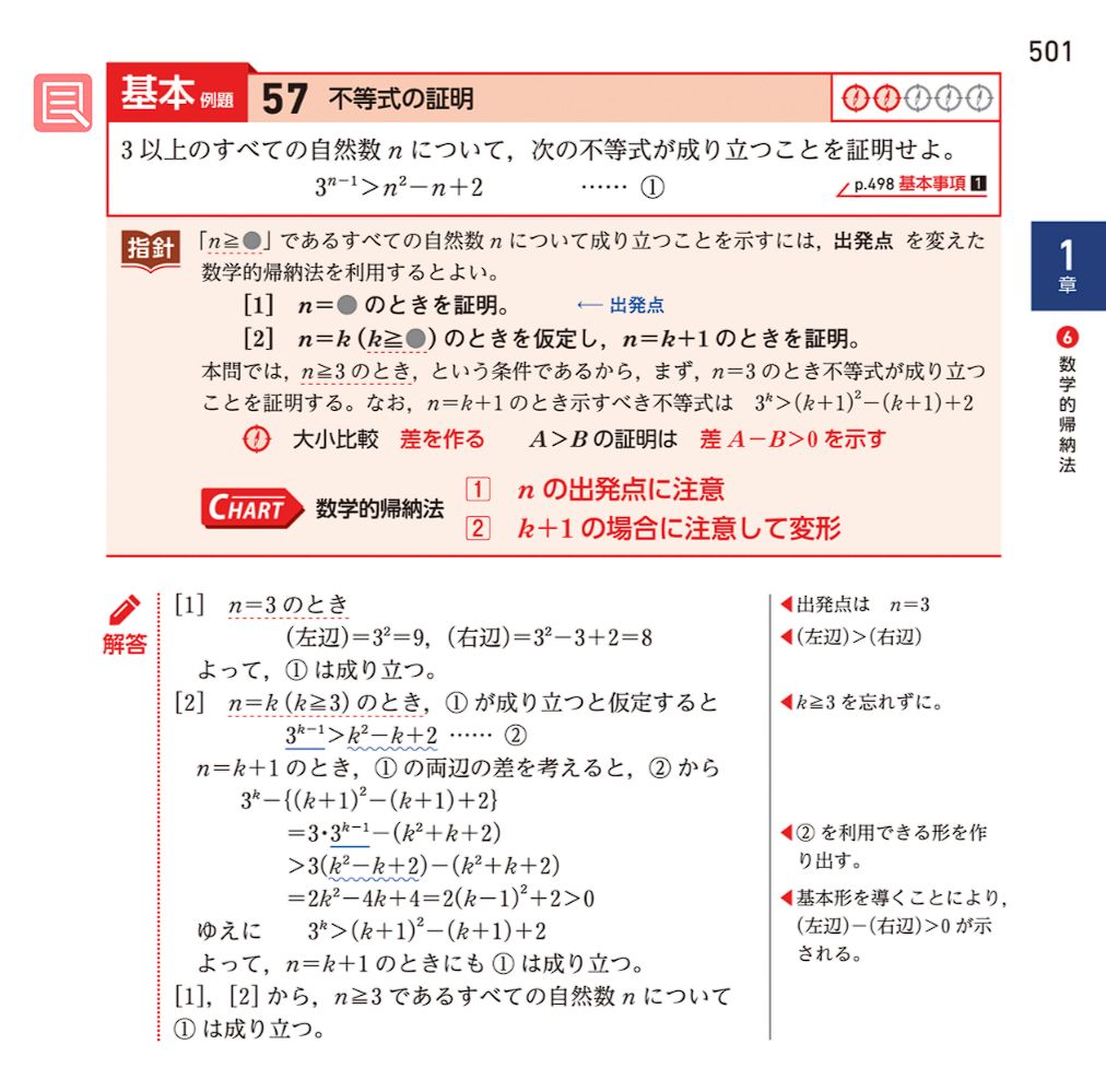 昨日と今日「青チャート式数学B 第1章 数列 第6節:数学的帰納法」の基本例題57を学習していました。