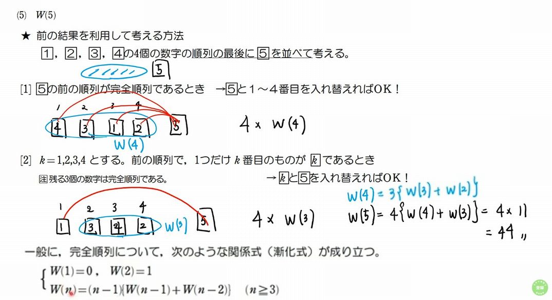 どうして [1],[2] の場合分けで、次の $ W(n+1) $ の場合を完全順列として "過不足なく" 数え上げられたことになるのか?